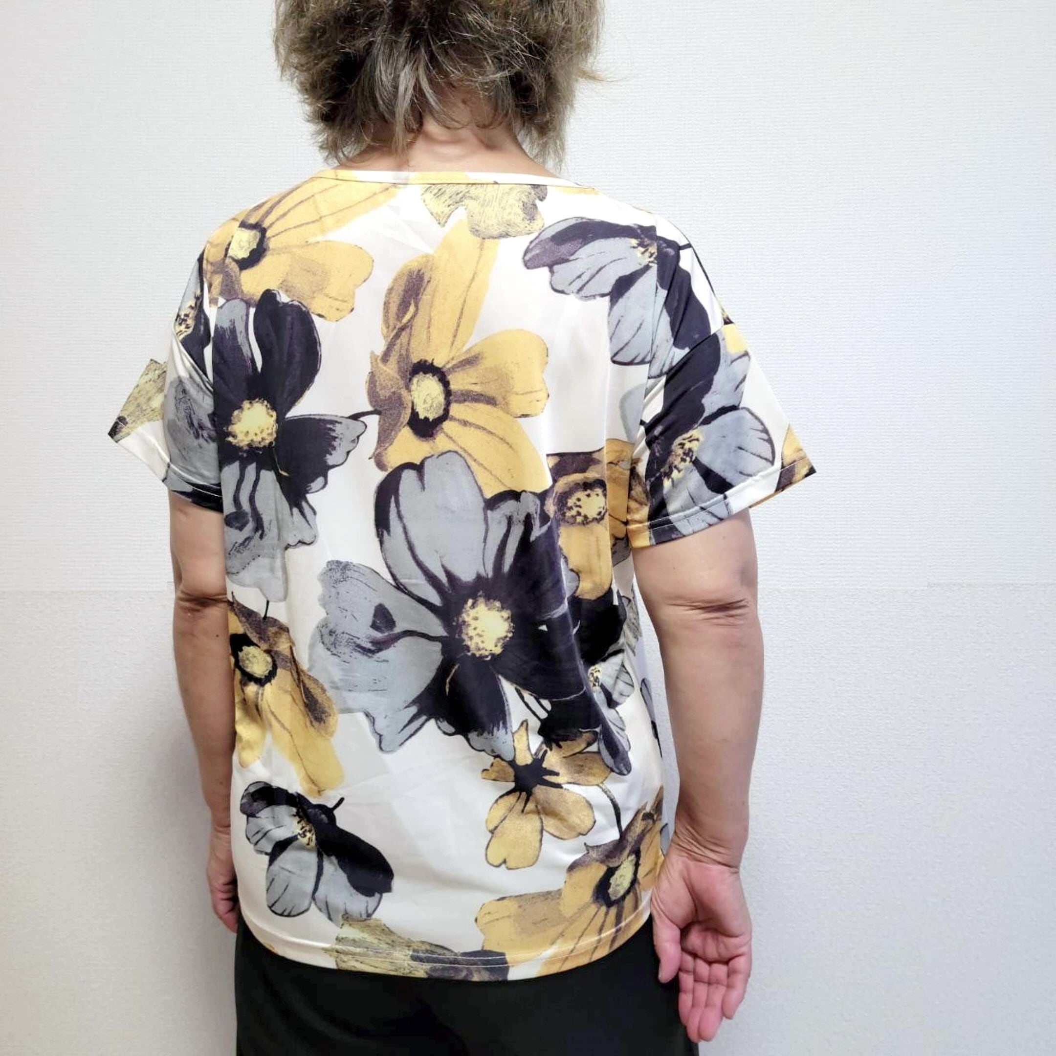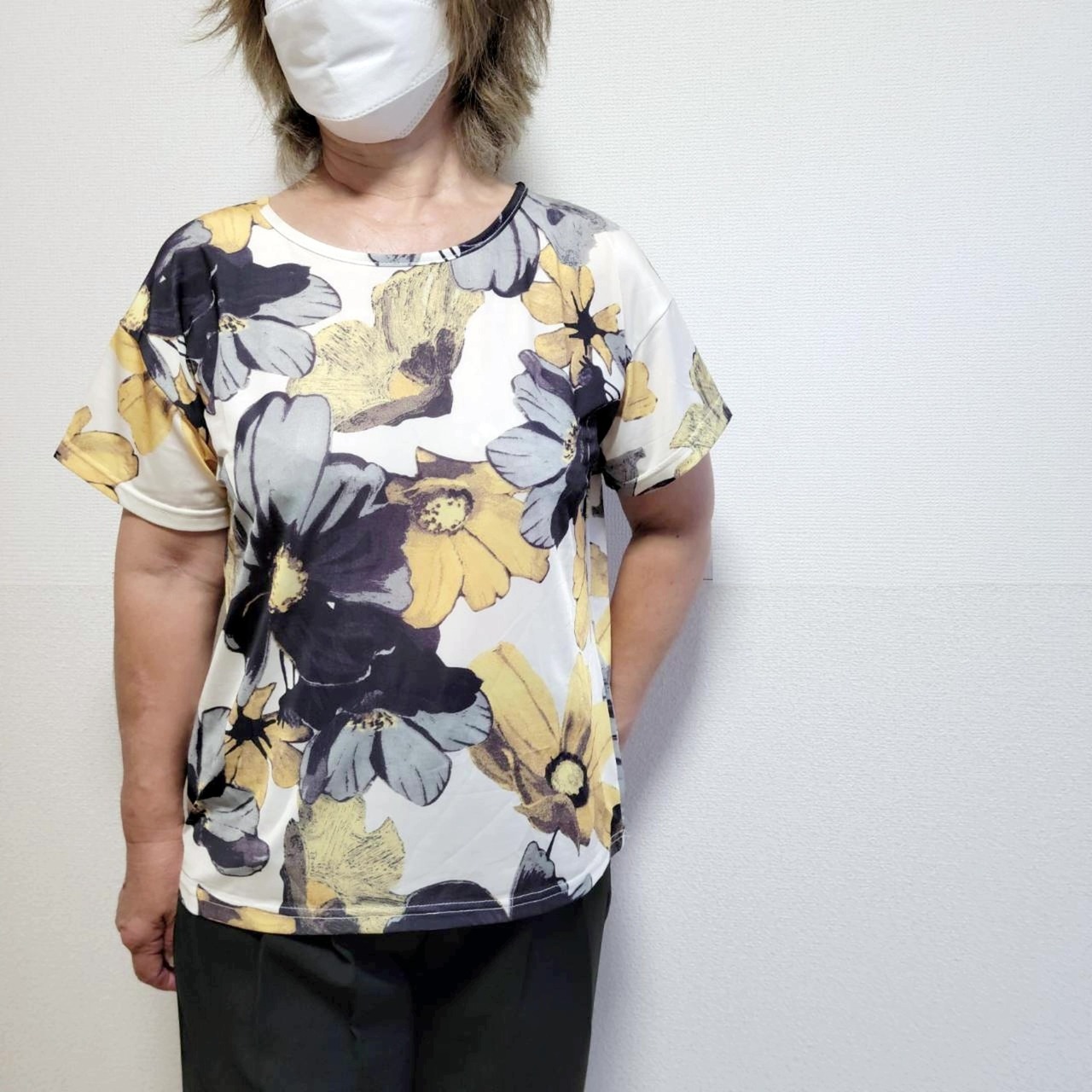 上品な大きめフラワープリントが目を引く半袖Tシャツ。