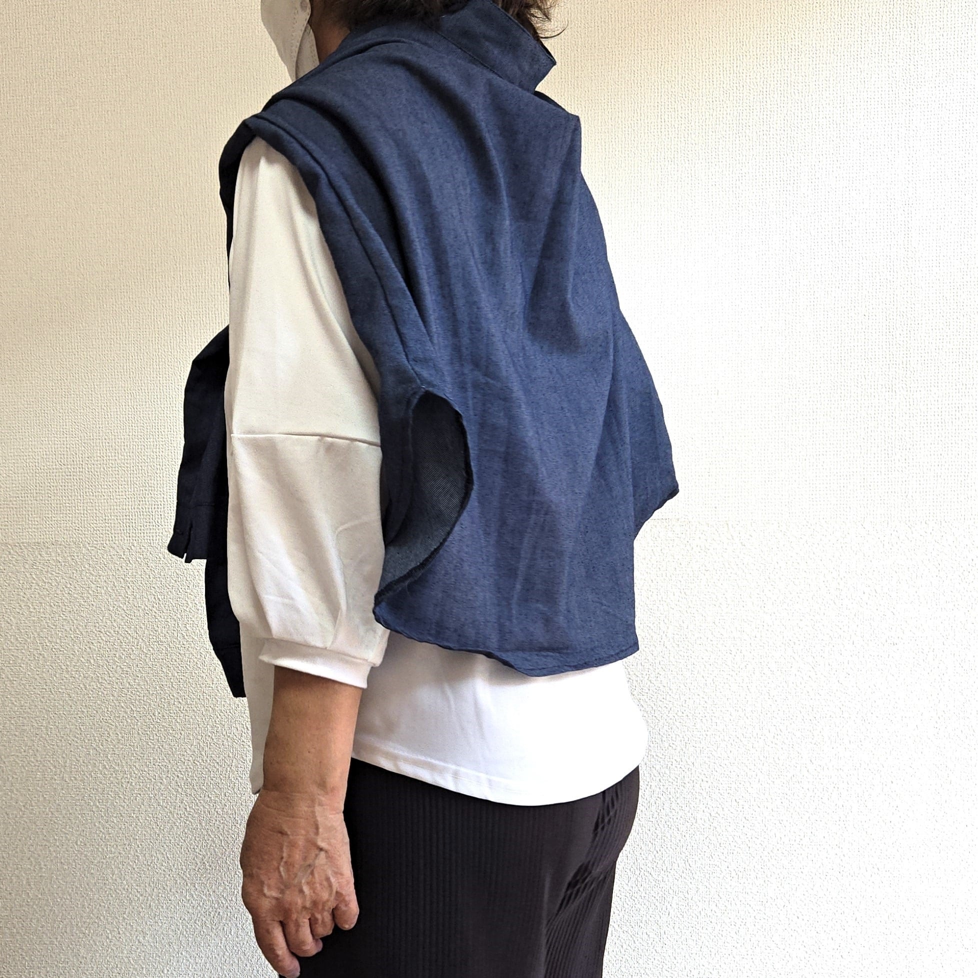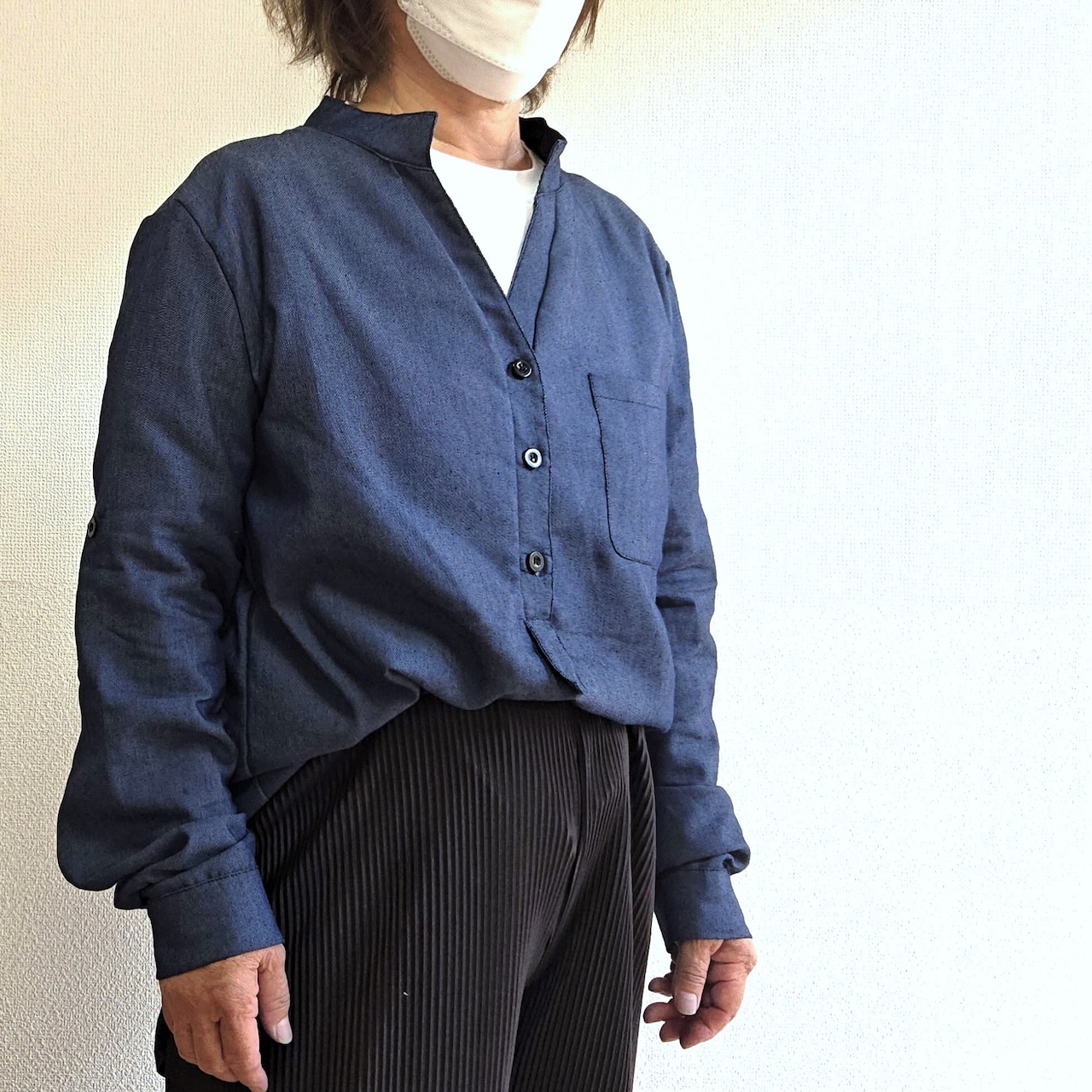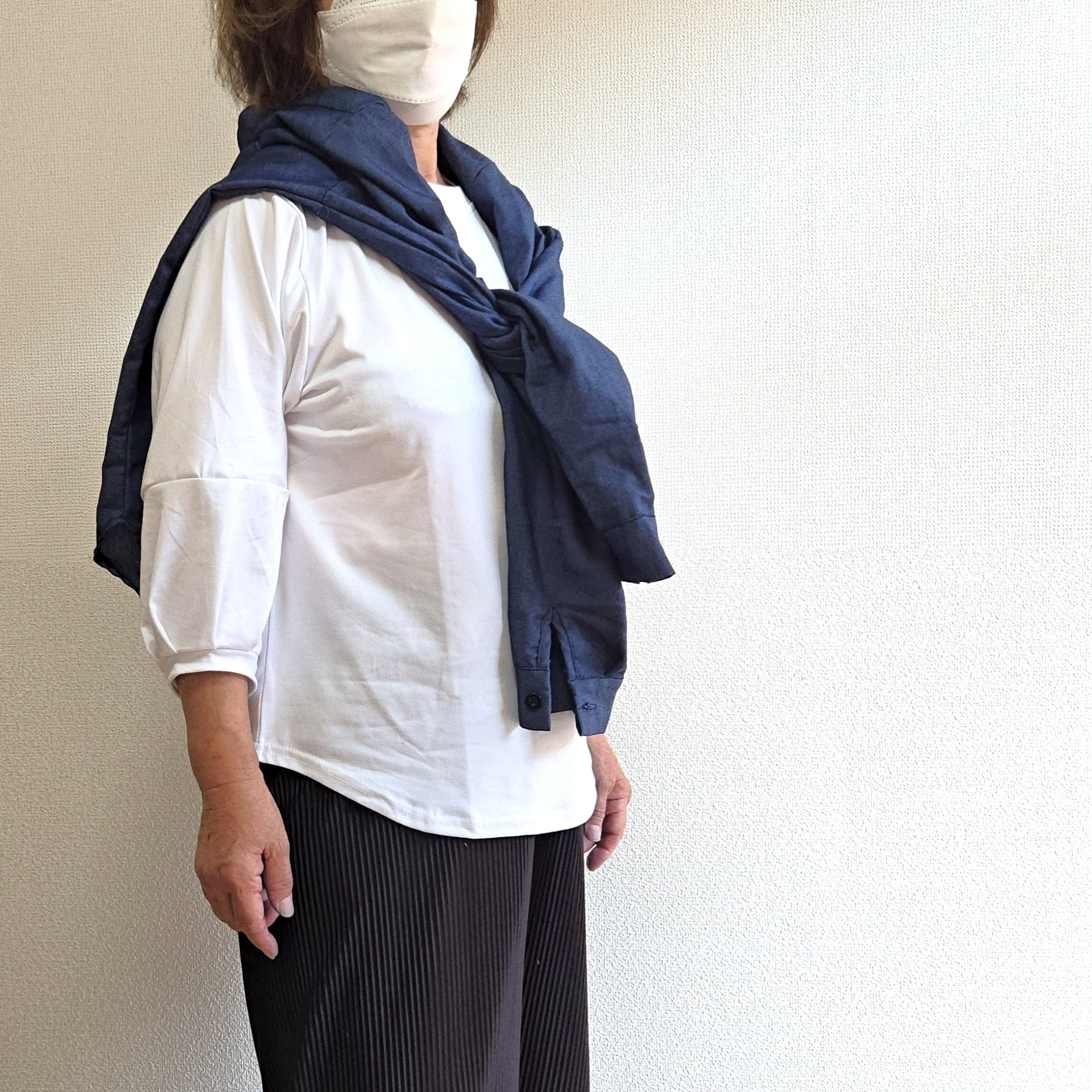 【ホワイト】デニムノーカラープルオーバーシャツ×レトロランタンスリーブ7分袖Tシャツセット|上品カジュアルスタイル【11月発送予約分】